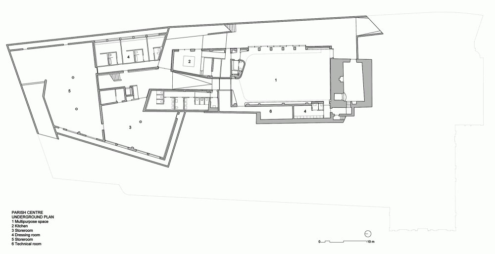 The actual parish centre is made by some small buildings from different ages where the monumental volume of the parish church stands out in the old central courtyard. This building is connected with the old centre by a sistem of ways, they are not only paths but they become a kind of space. The addiction is composed by three levels: in the basement there are the services, while the entrance, the secretary and the cafè are in the ground floor, in the first floor there are three new classrooms and the connection with the others classrooms of the old parish centre. The new building has a sculptural form, where the plan merges the perspective drawing. Only the reinforced concrete can give this kind of sensation, special attention had to be given to the wall formwork that are specifically design to reach this target.