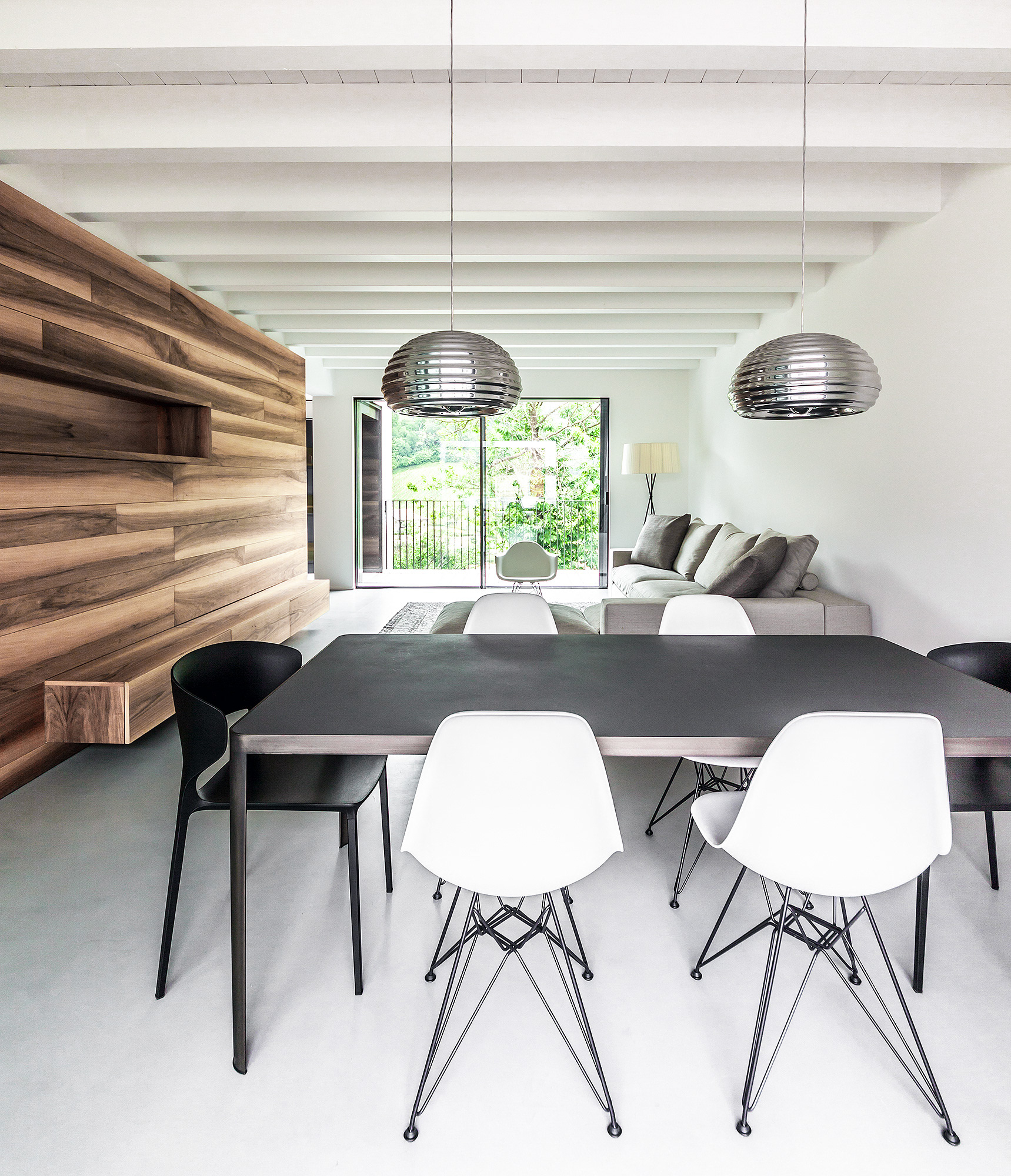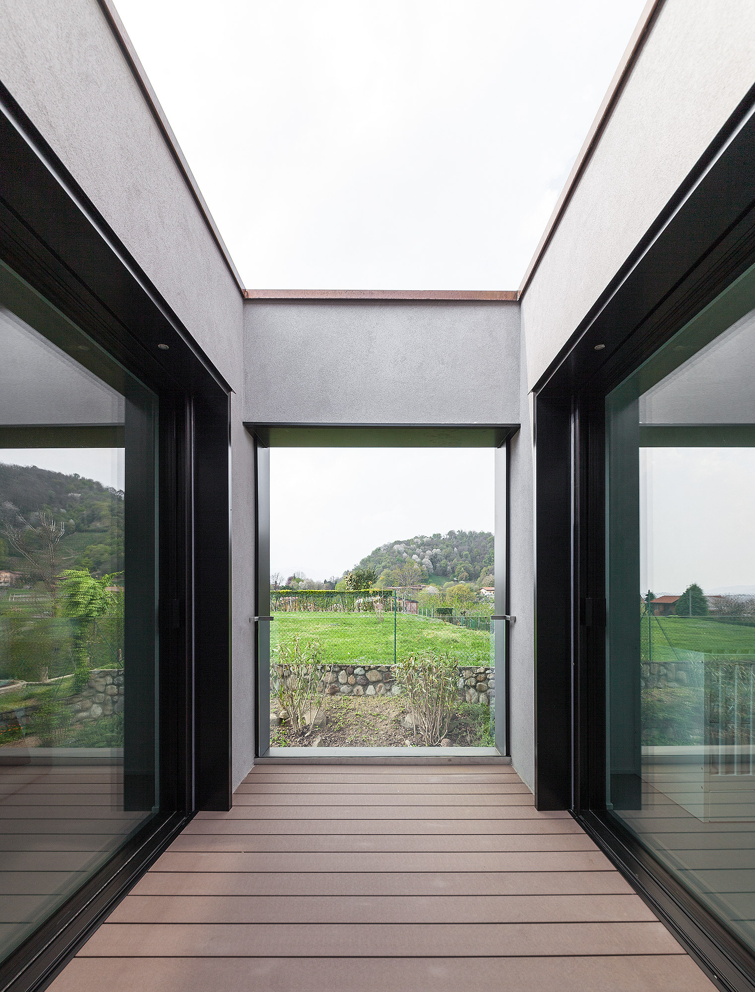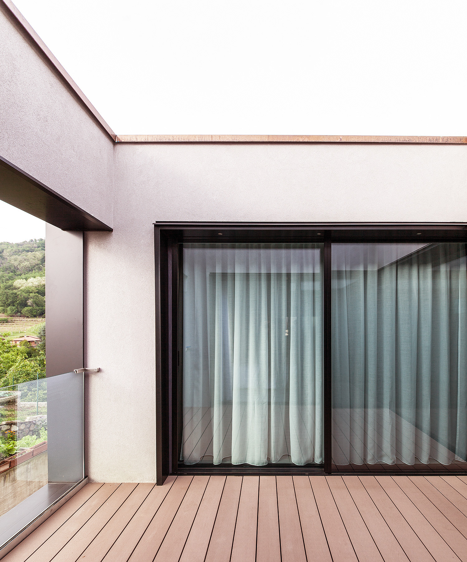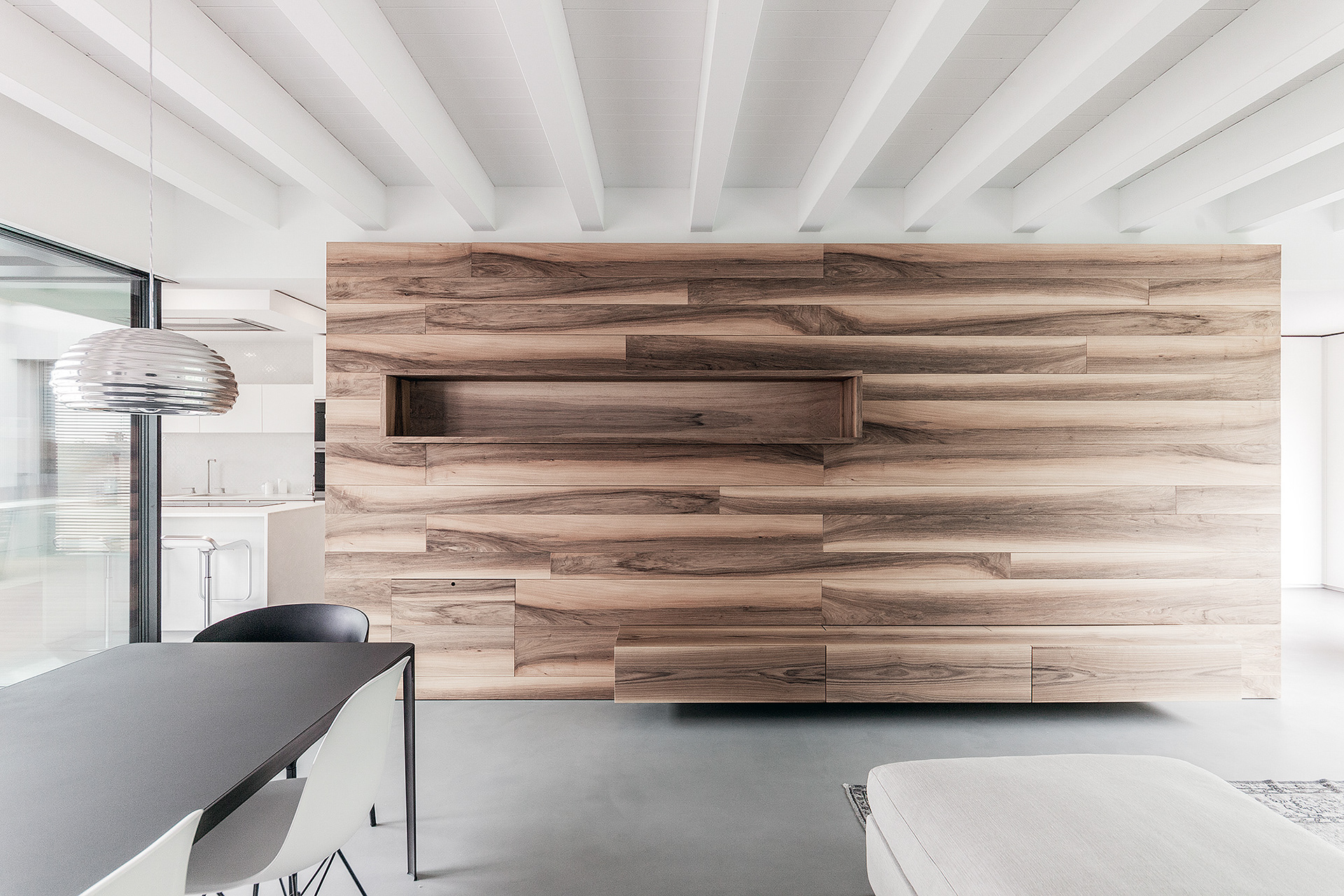 The parents home built in 2007 has been expanded to form a new apartment for the daughter. The concept behind the project starts from the desire to create living spaces that, although open to the landscape, allowing some privacy and confidentiality. In this sense, the house is a large space divided into rooms in continuity with small patios. New element that organizes the hierarchy of the house is represented by a central block lined with walnut slats that articulates and divides the internal functions and which contains the elevator shaft and services.