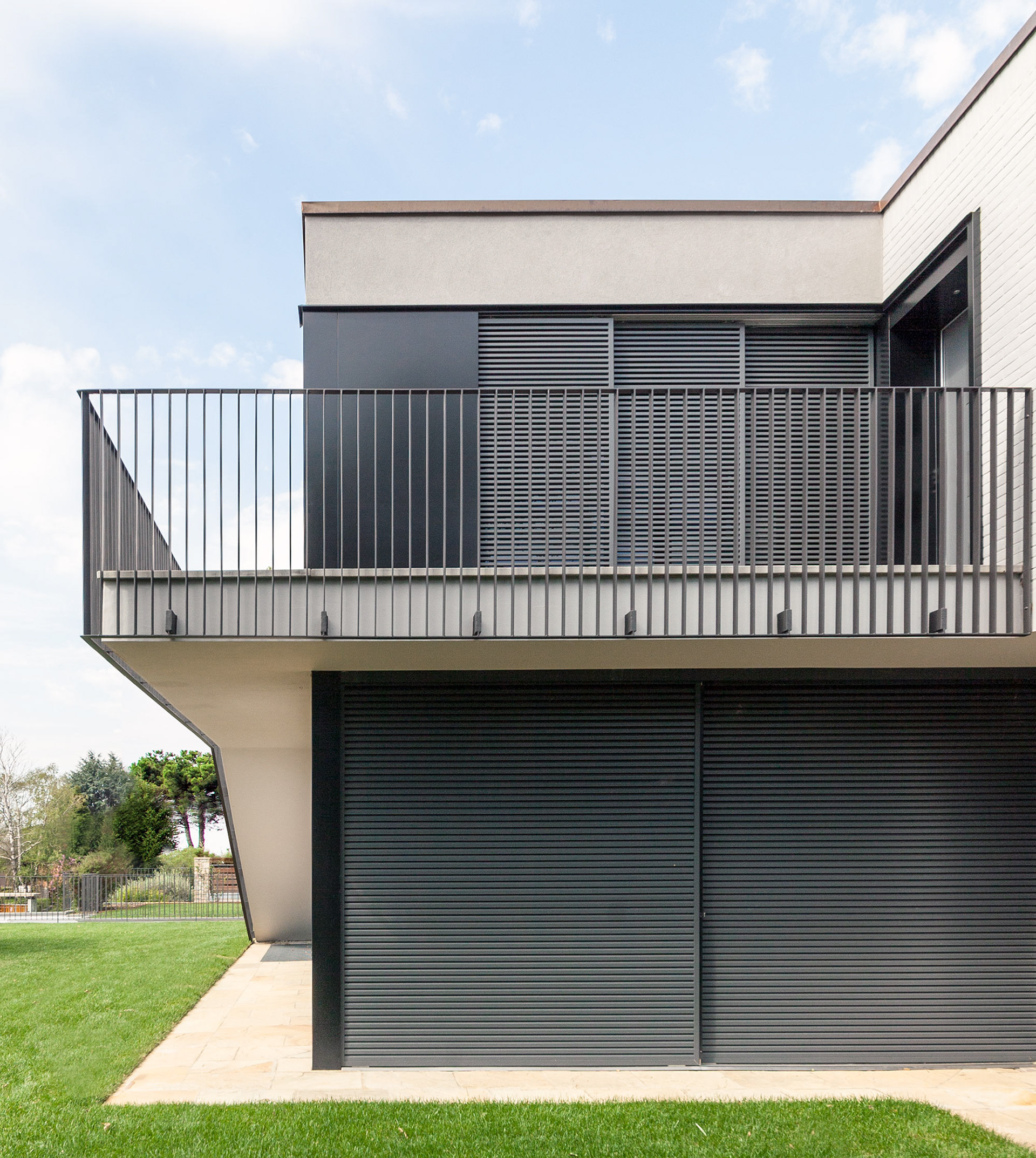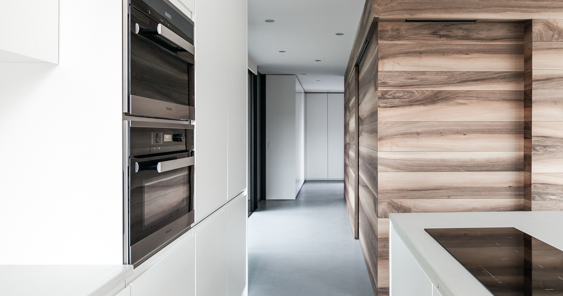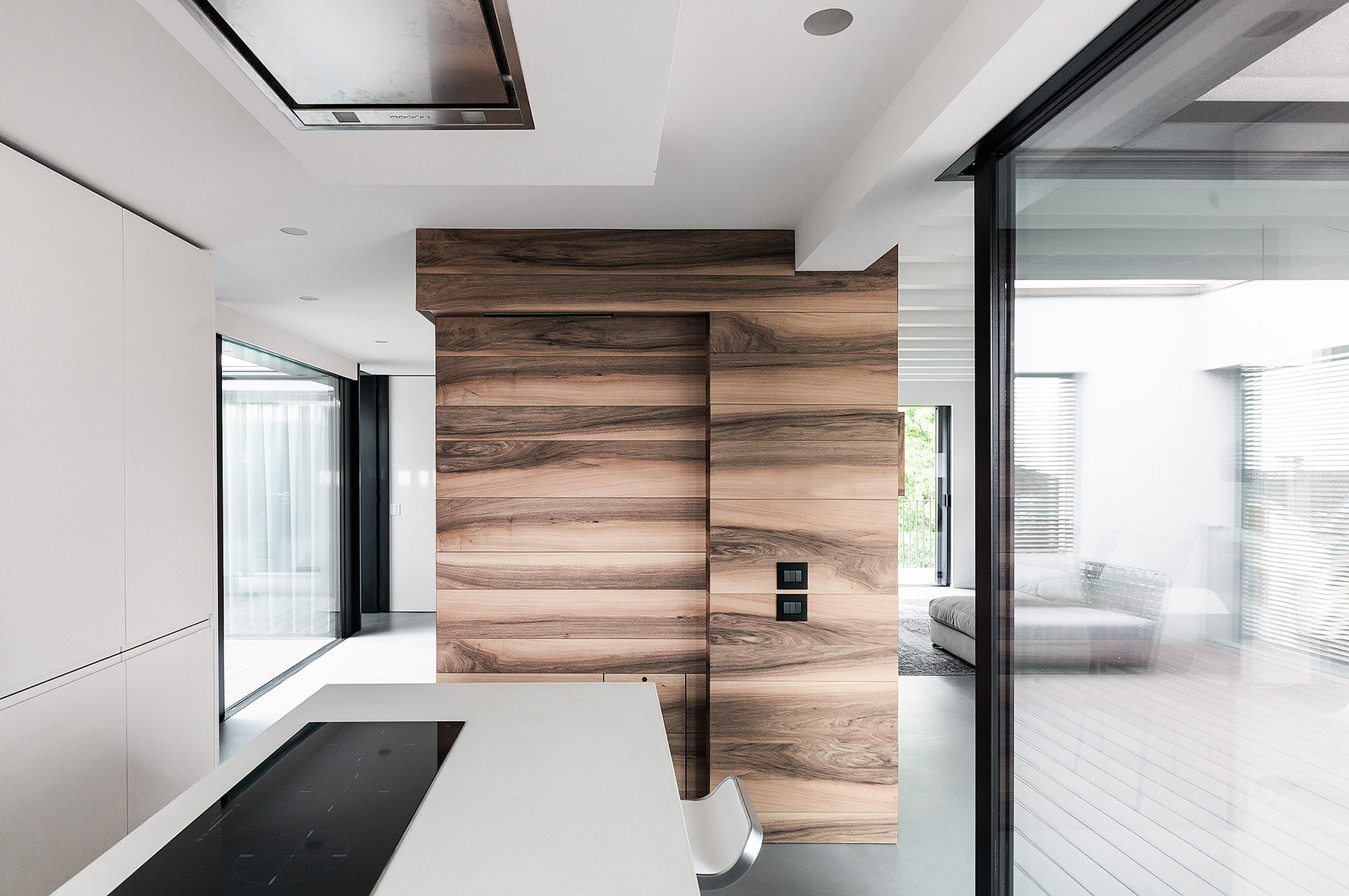 The parents home built in 2007 has been expanded to form a new apartment for the daughter. The concept behind the project starts from the desire to create living spaces that, although open to the landscape, allowing some privacy and confidentiality. In this sense, the house is a large space divided into rooms in continuity with small patios. New element that organizes the hierarchy of the house is represented by a central block lined with walnut slats that articulates and divides the internal functions and which contains the elevator shaft and services.