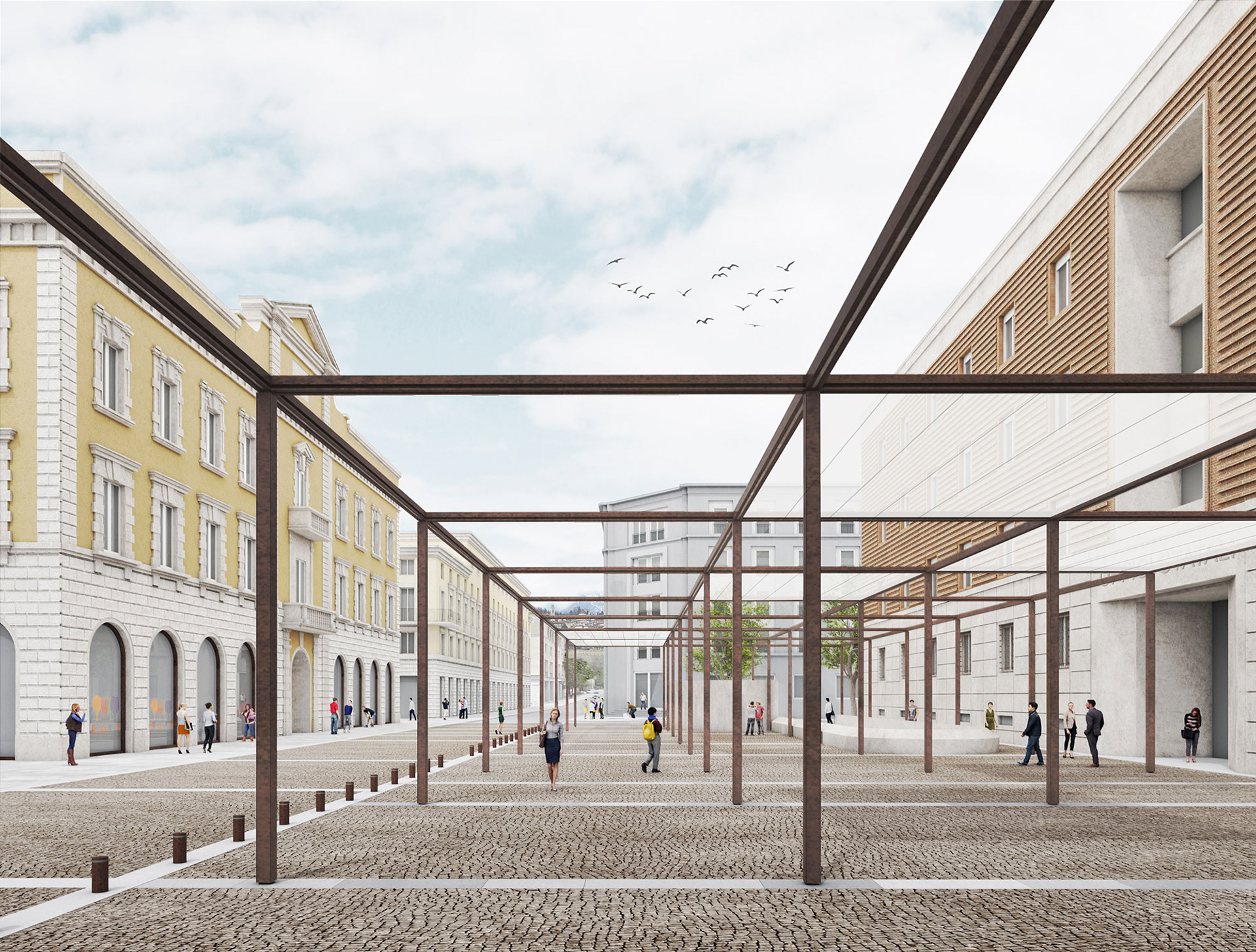 Sulla copertura del nuovo parcheggio interrato si libererà il suolo oggi occupato dal parcheggio a raso che verrà eliminato, con la possibilità di far rivivere questa parte di città, che soffre per la scarsità di flussi e di poli attrattivi. La rifunzionalizzazione del prospettante Palazzo degli Uffici Statali (in fase di dismissione) per attività che nel bando vengono indicate di tipo prevalentemente commerciale e turistico-ricettive , potrà contribuire notevolmente alla rimessa in moto di questa parte del Centro. La nuova piazza diverrà il luogo vocato allo svolgimento di tutte quelle attività di mercato ambulante di varie tipologie che attualmente trovano collocazione in vari periodi dell’anno lungo il Sentierone e lungo Largo Gavazzeni. Considerata la varietà tipologica degli esercenti, il progetto, lasciando la massima libertà e flessibilità, inserisce un criterio di ordine chiaro e rispondente alle caratteristiche del tessuto urbano del Centro piacentiniano, con la costruzione di una ‘griglia’ stereometrica, basata su una maglia tridimensionale calibrata sulle misure del fronte del palazzo uffici, tale da consentire un’organizzazione razionale. La griglia sarà composta da profilati metallici che porteranno i sistemi di illuminazione. La piazza potrà essere completamente aperta verso il cielo oppure, mediante un sistema di tende scorrevoli, coperta e ombreggiata.