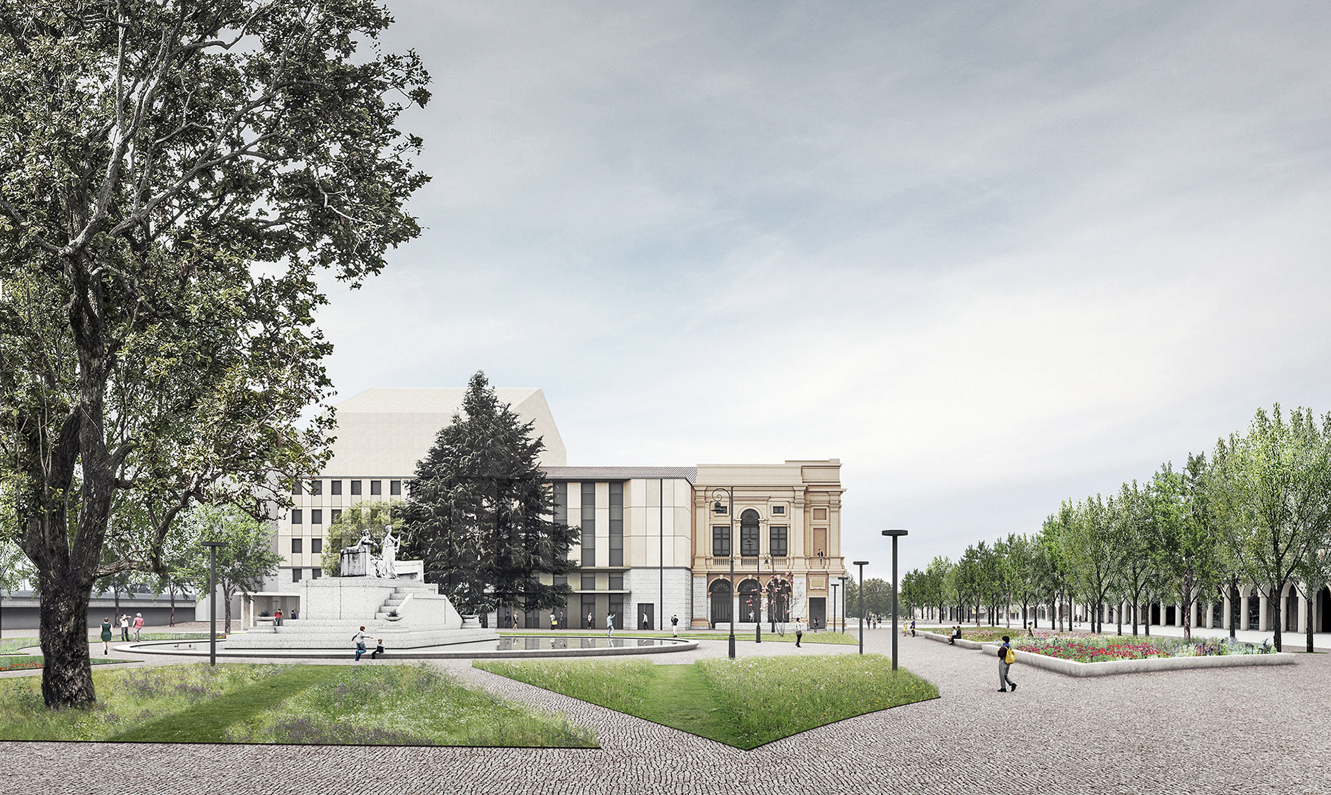 E’ prevista la rimozione della collinetta rialzata retrostante e delle relative alberature sempreverdi con l’obbiettivo di eliminare la zona di criticità descritta e di rischiarare l’atmosfera complessiva, ricentrando l’attenzione sul monumento che sarà così percepibile a 360°, anziché da una posizione esclusivamente frontale. La vasca sarà delimitata da un bordo rialzato atto ad essere liberamente utilizzato come seduta: diventerà così un elemento attrattivo e ludico, fuoco visivo e fondale scenico per i vari usi proposti nello spazio pubblico.