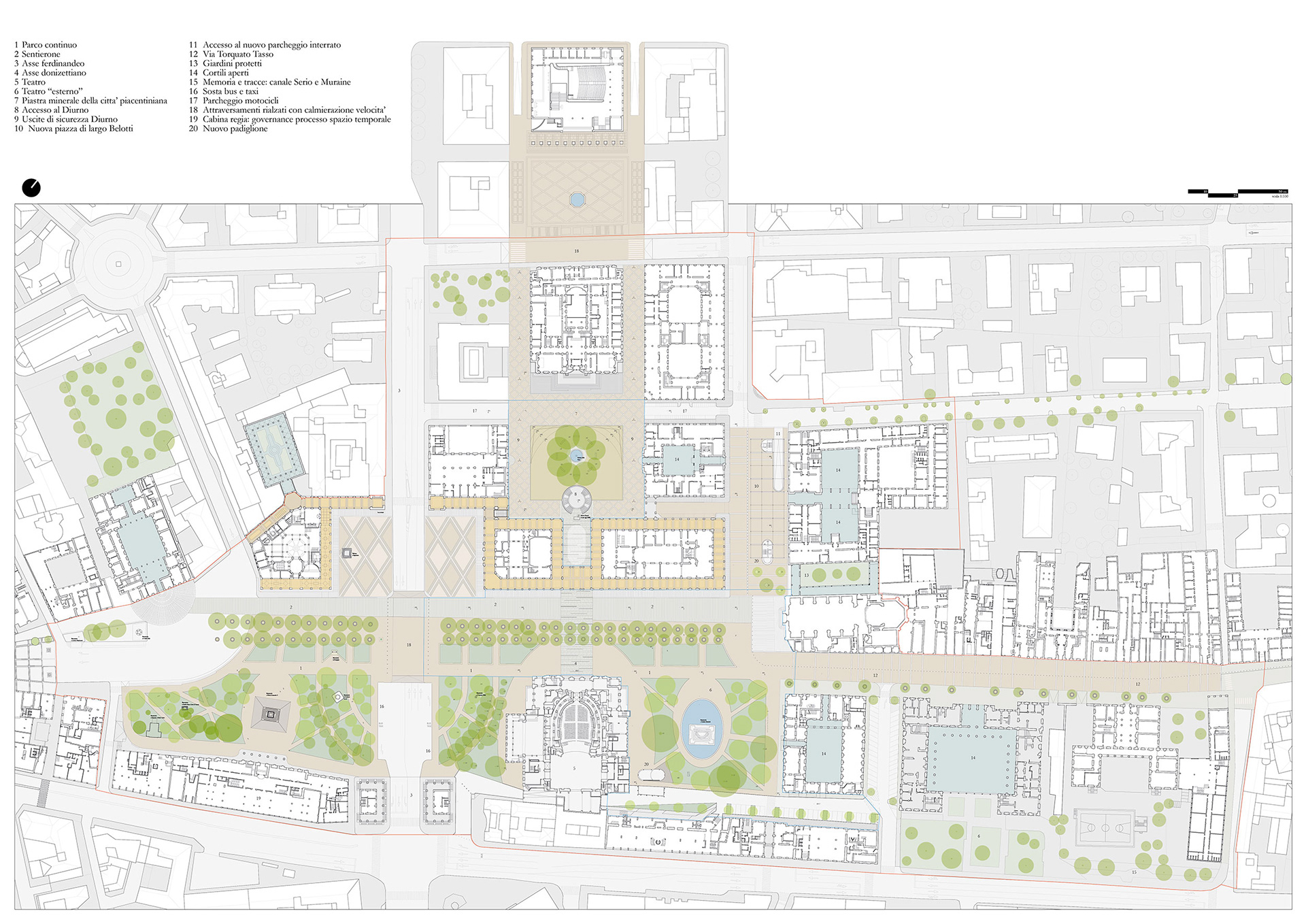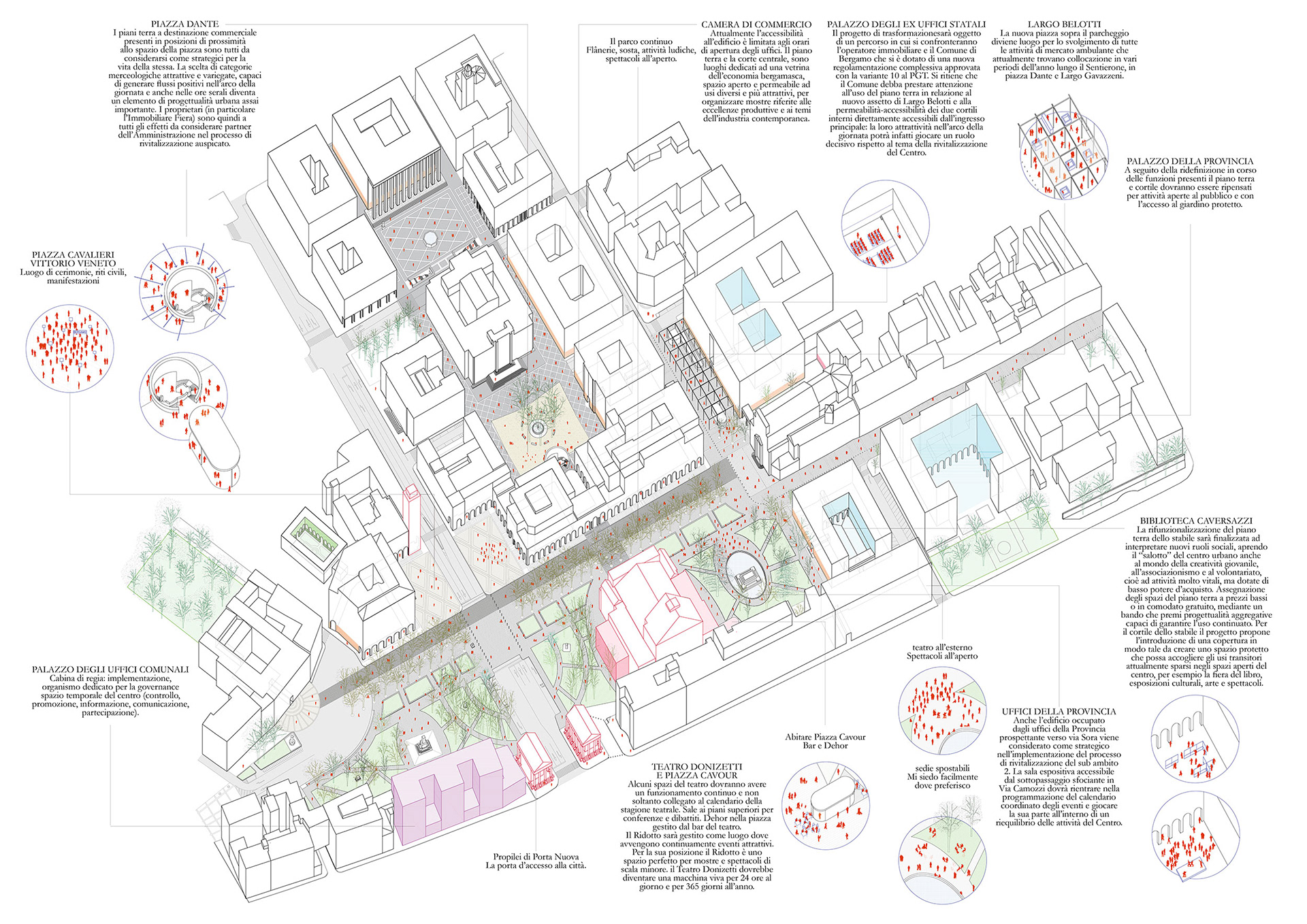 Bergamo e il suo territorio sono costruiti su rapporti antitetici e tuttavia imprescindibili e complementari. Questo carattere di contrapposizione tra le parti è ricorrente e si coglie chiaramente sia alla grande scala (nella relazione tra montagne e pianura, tra la Città Alta e la Città Bassa), sia nella stratificazione della coscienza sociale, economica e culturale (capoluogo-provincia, sacro-profano, lavoro-divertimento). In questo sistema di cose un luogo in particolare assume nella storia della città il ruolo di spazio condiviso e deputato alla messa in scena delle contraddizioni urbane e umane: un grande prato rigoglioso di piante e frutti si trasforma nel tempo in piazza di pietra dove si vende e si compera, dove si ride e si prega, è il Sentierone. Il nome ha origine da un grande prato rimasto per secoli sospeso tra i borghi e la città sul colle, un luogo dedicato già dal medioevo allo scambio e al commercio. Il “Prato di Sant’Alessandro”, per la sua posizione e per le sue tradizioni diviene centro della città contemporanea e ancora una volta si assiste ad un’apparente contraddizione in cui la campagna si sovrappone alla città e viceversa. Il progetto propone un lavoro in continuità con il luogo strutturandosi secondo fasce parallele all'asse del Sentierone: il verde del nuovo parco continuo si intreccia con agli assi di Palazzo Frizzoni, di Porta Nuova, del Teatro, del Monumento a Donizetti, rafforzando la trama di segni già presenti e ancora in grado di riaffermare i caratteri del centro moderno della città.
