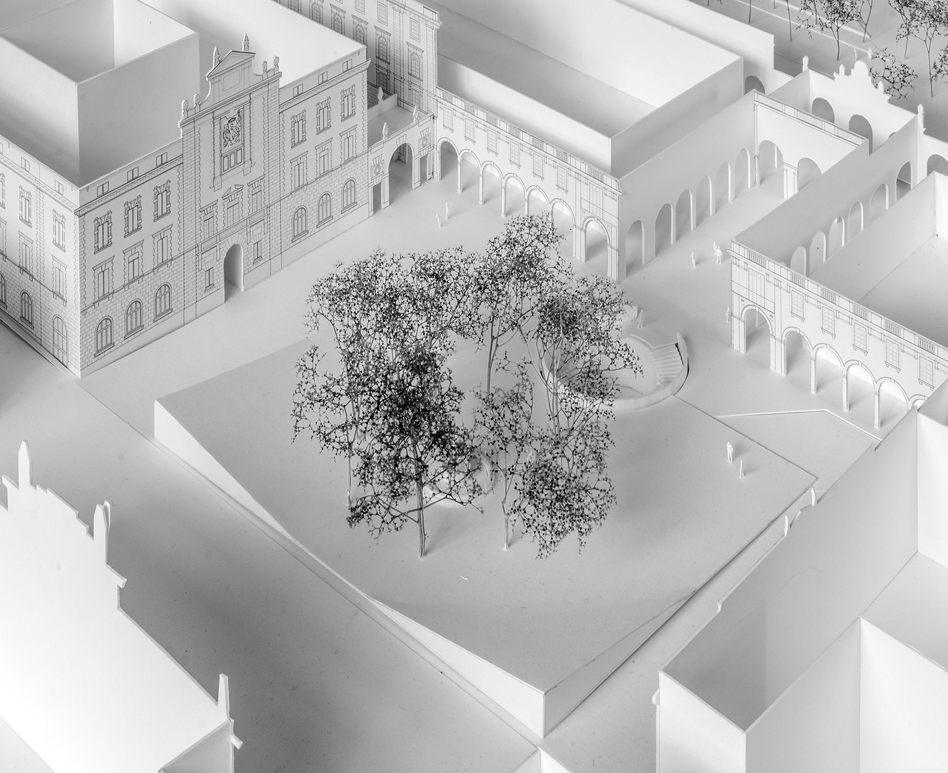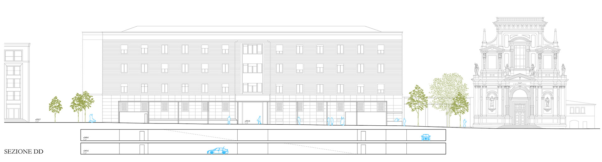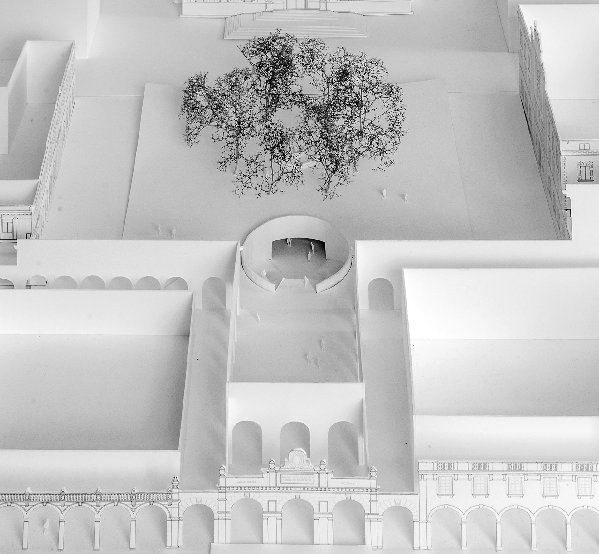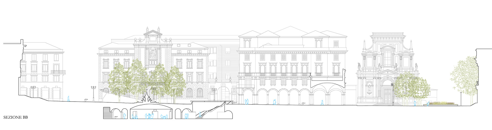La nuova piazza ribassata emergerà soltanto con un parapetto circolare in cemento bianco, tale da non costituire alcun ostacolo visivo alla percezione in profondità della fontana del Caniana (assunta come elemento fortemente connotativo dello spazio urbano).