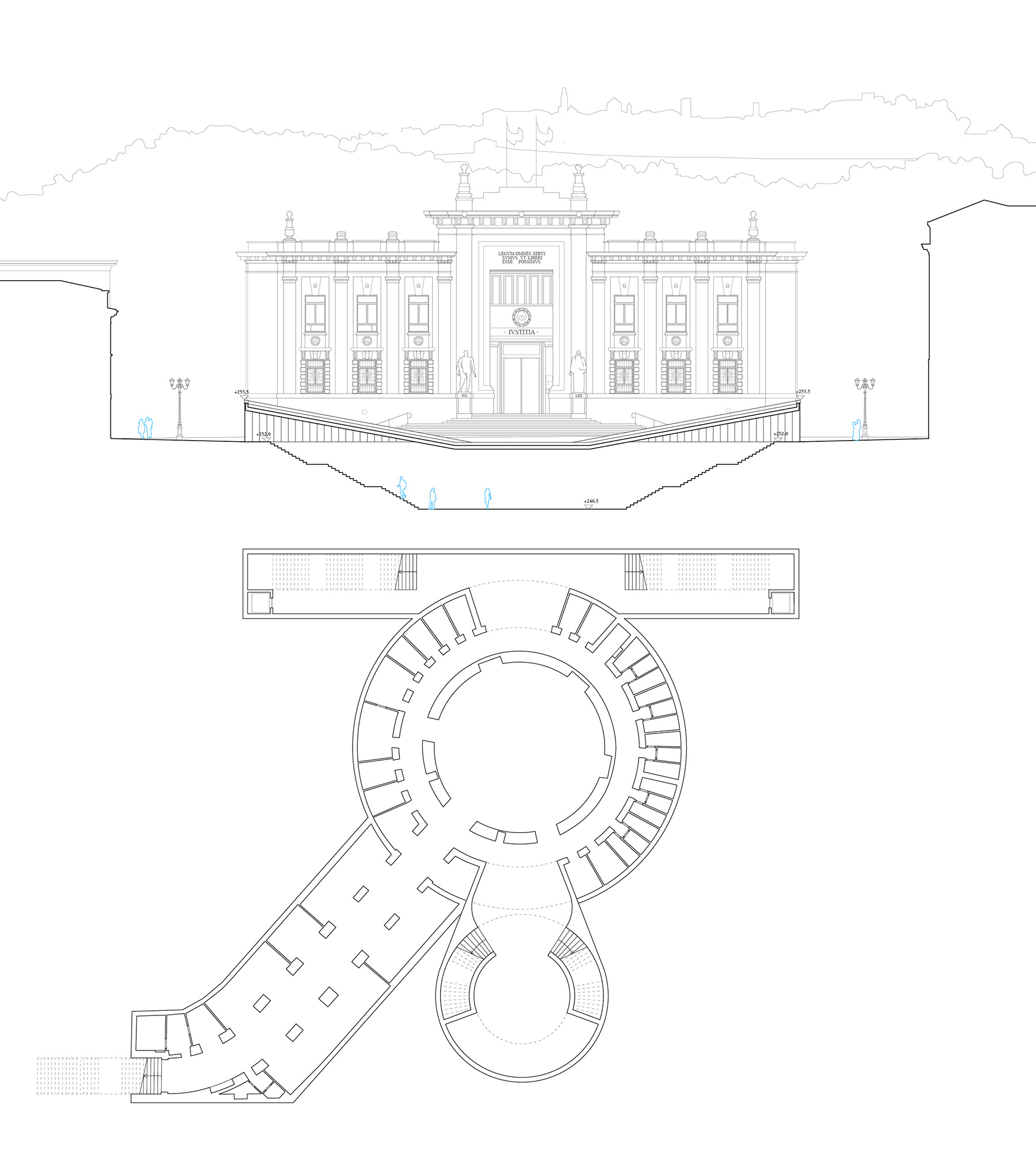 La nuova impronta circolare allineata lungo l’asse che collega la piazza Dante all’entrata principale del teatro Donizetti, sarà una sorta di piazza a livello ribassato nella quale troveranno posto due comode rampe di scale per l’entrata e l’uscita allo spazio sotterraneo. Il diametro coincide con la larghezza dello spazio a cielo libero del Quadriportico per il quale è prevista la nuova pavimentazione lapidea collegata al teatro Donizetti.