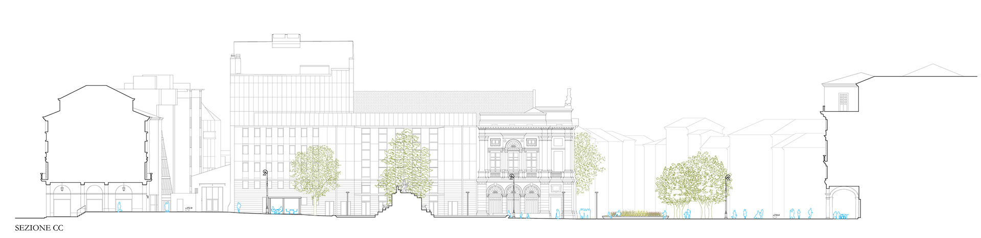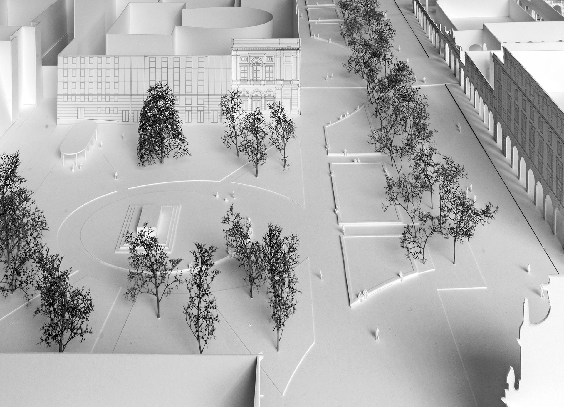 La nuova piazza ribassata si inserisce quindi nella sequenza degli episodi allineati lungo una prospettiva centrale nel tessuto piacentiniano dal teatro fino al Palazzo della Libertà nel piano terra del quale, in base al recente accordo siglato dall’amministrazione, troveranno sede nuove attività culturali legate al mondo dell’arte e dello spettacolo, con un conseguente arricchimento e potenziamento funzionale dell’offerta di servizi e poli attrattori lungo questa direttrice.