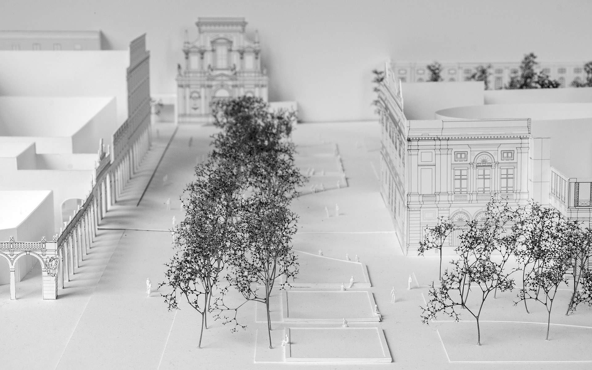 Nella forma e nella disposizione i nuovi parterre non cercano un nuovo ordine in contrasto con quello esistente, ma assumono i segni della città stratificata come trama su cui intrecciare semplici estrusioni di suolo abitati dai colori della vegetazione. Il pozzo di Piazza Dante, il tappeto di pietra del Teatro, le aiuole sotto gli ippocastani del Sentierone costituiscono gli elementi del progetto. Si tratta di piccoli segni in grado di dialogare con la grande scala dei monumenti e degli spazi urbani lungo i quali insistono. Il Quadriportico, la chiesa di San Bartolomeo, il teatro Donizetti, la torre dei Caduti e gli altri edifici del Centro Piacentiniano si ritrovano cosi ad essere attraversati da una finissima trama di segni che propone un racconto delicato su un’idea di città sospeso nel verde tra le pietre.