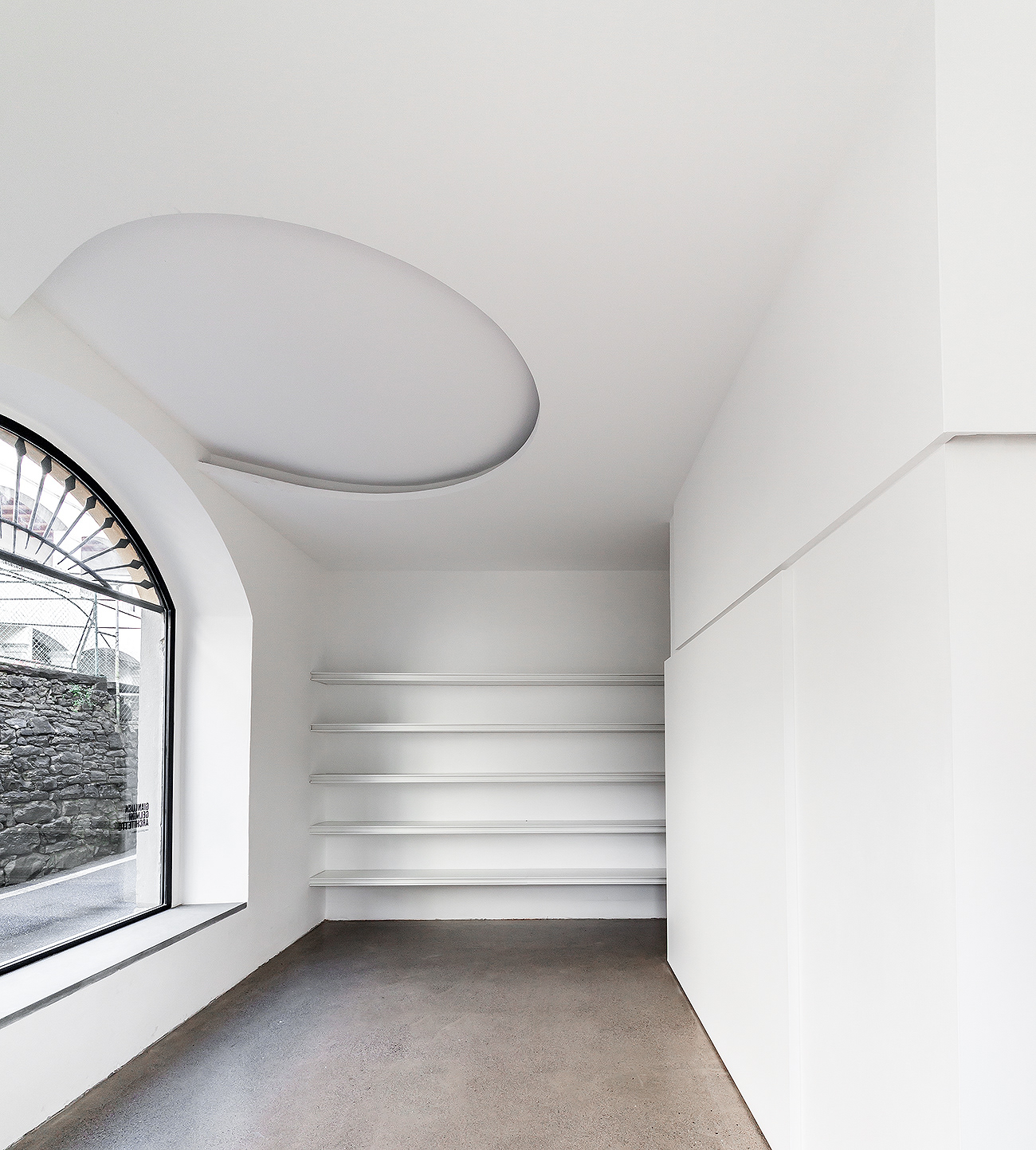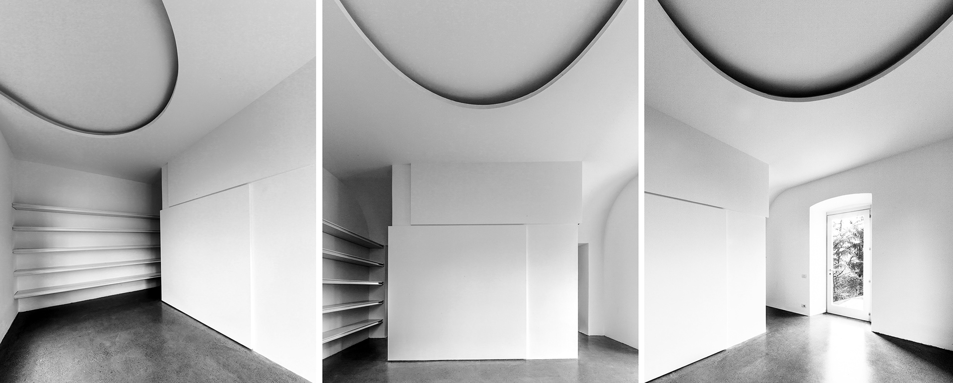 L’edificio si articola su cinque livelli due dei quali non visibili dalla strada perché incassati nel pendio della collina. I locali dello studio si dispongono a piano terra con ingresso diretto dalla strada e nei due piani sottostanti affacciati sul cortile interno. Il progetto di sistemazione rispetta l’impianto tipologico e i caratteri spaziali e materiali degli ambienti, limitandosi ad una loro valorizzazione e rimessa in funzione.