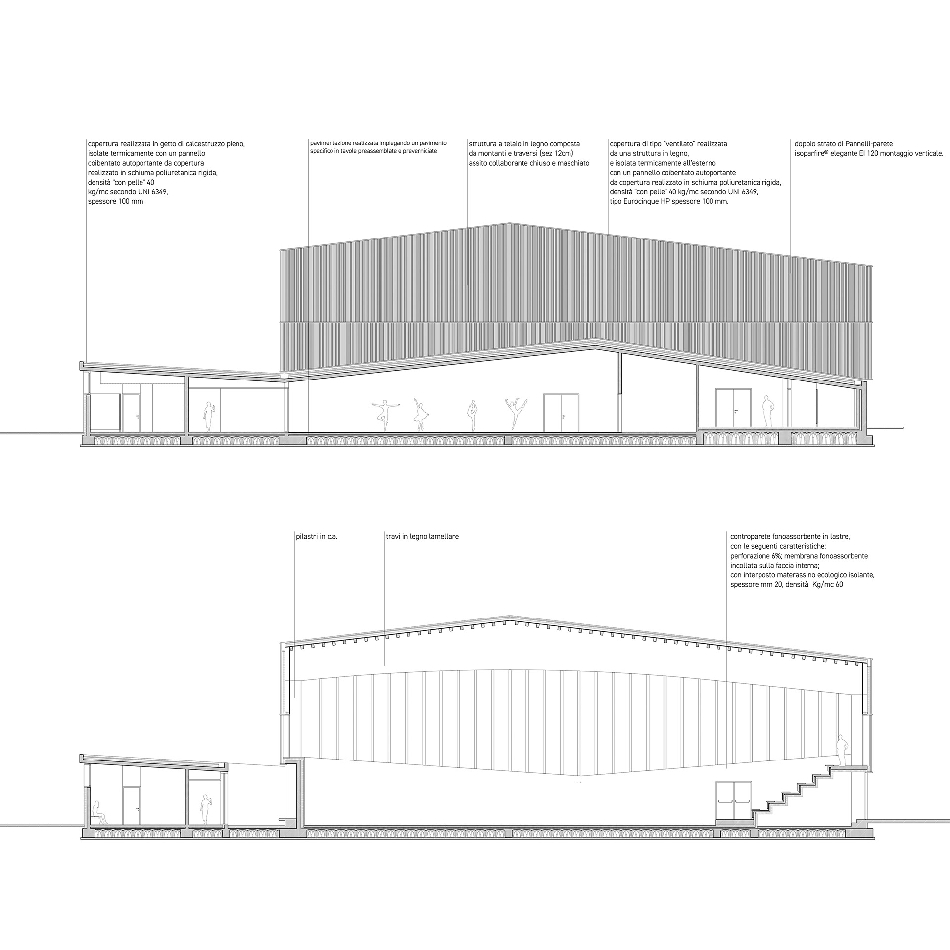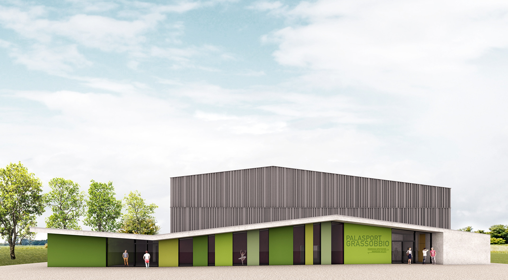 Abbiamo articolato il nuovo Palazzetto dello sport  in due corpi di fabbrica: il volume alto della palestra e il corpo basso degli spogliatoi e dei servizi complementari. Tutti gli spazi si dispongono su unico livello direttamente accessibili dal piano di campagna, non ci sono scale, non ci sono ascensori.