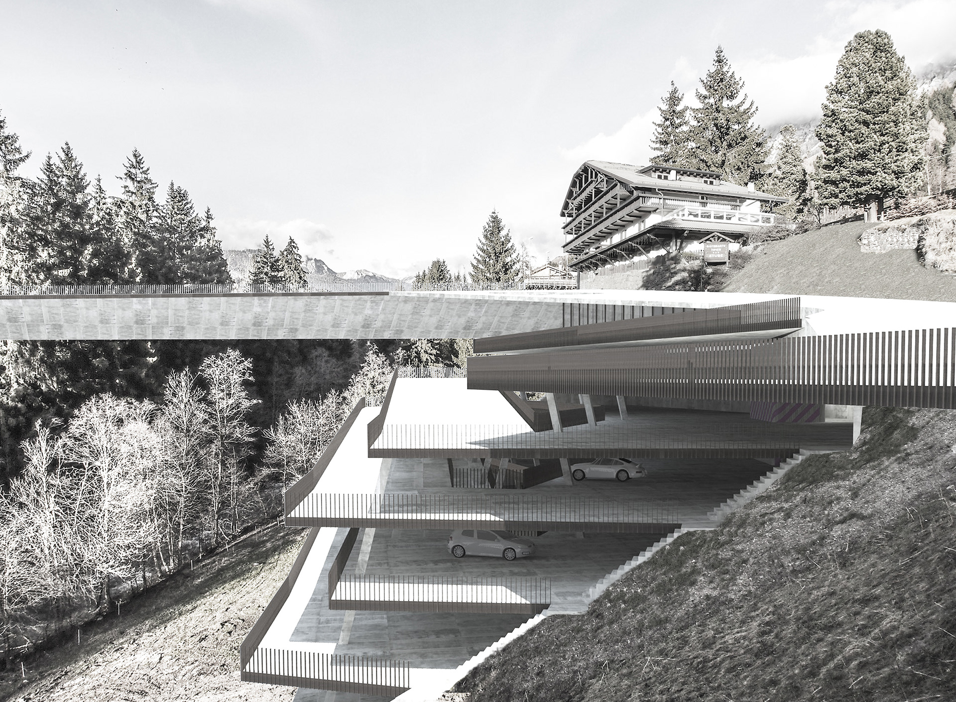 L’idea del posteggio e sosta veicolare come mera infrastruttura muta, diventa percorso discendente attraverso il quale lentamente immergersi nella natura in modo fluido. Il tratto di lungofiume dal parcheggio al paese è pensato come parco pubblico lineare, spazio per il tempo libero in un’ottica di recupero funzionale degli argini. Fluidità e continuità sono i due caratteri salienti della nuova struttura, sia che la si transiti in automobile sia che la si percorra a piedi. Il progetto proposto offre una terza via tra quelle possibili: un posteggio multipiano in costante dialogo col luogo a partire dalla suggestione da cui si origina: il tornante.