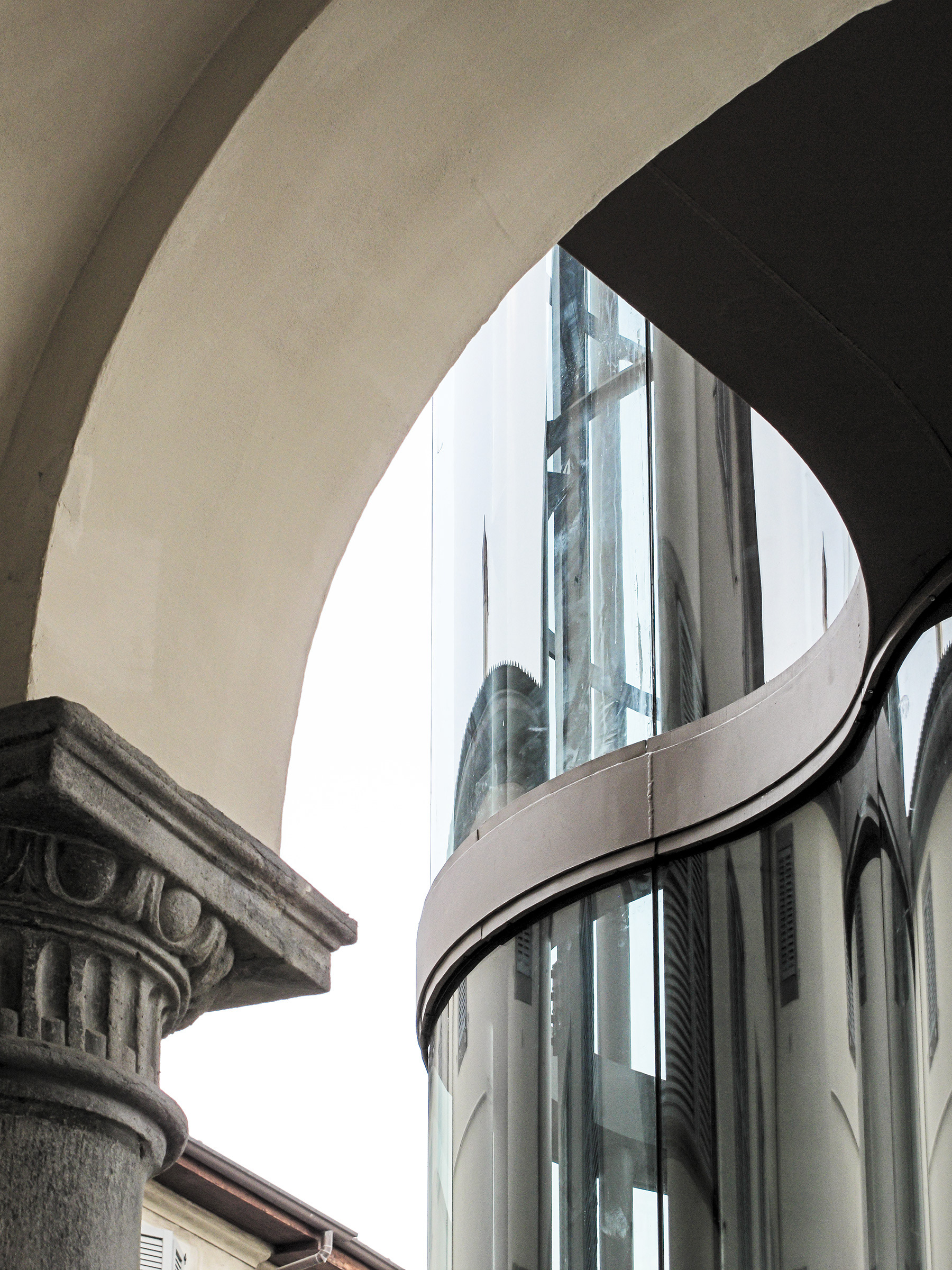 Aspetto rilevante del progetto è rappresentato dalla necessità di realizzare elementi in aggiunta alla fabbrica storica che consentano l’uso dell’edificio come centro culturale e museale in parallelo alla funzione residenziale che già svolge. Il concetto che sta alla base del ridisegno delle parti esterne e del nuovo corpo scala propone una sorta di richiamo al rapporto un tempo esistente tra palazzo e giardino. La scala in acciaio e vetro, si innalza trasparente dal cortile pavimentato. Al di sotto del cortile un’ampia sala ipogea amplia gli spazi esistenti disposti su tre livelli espositivi