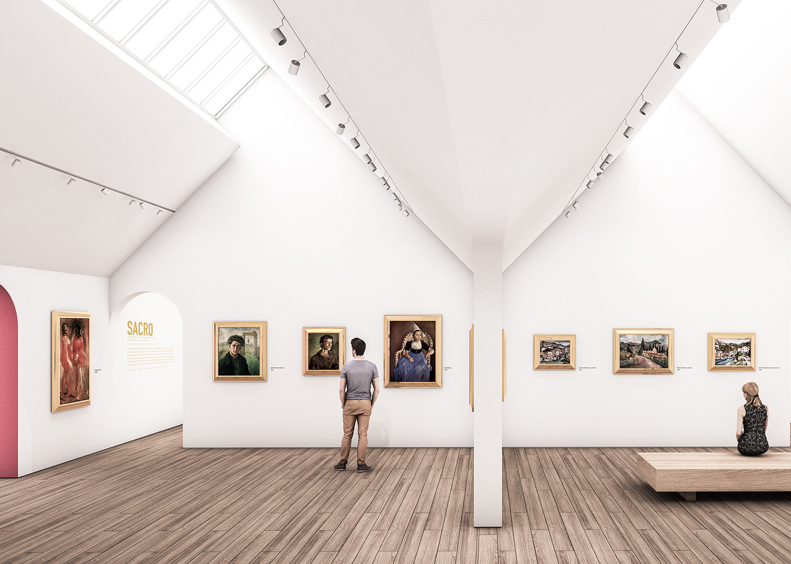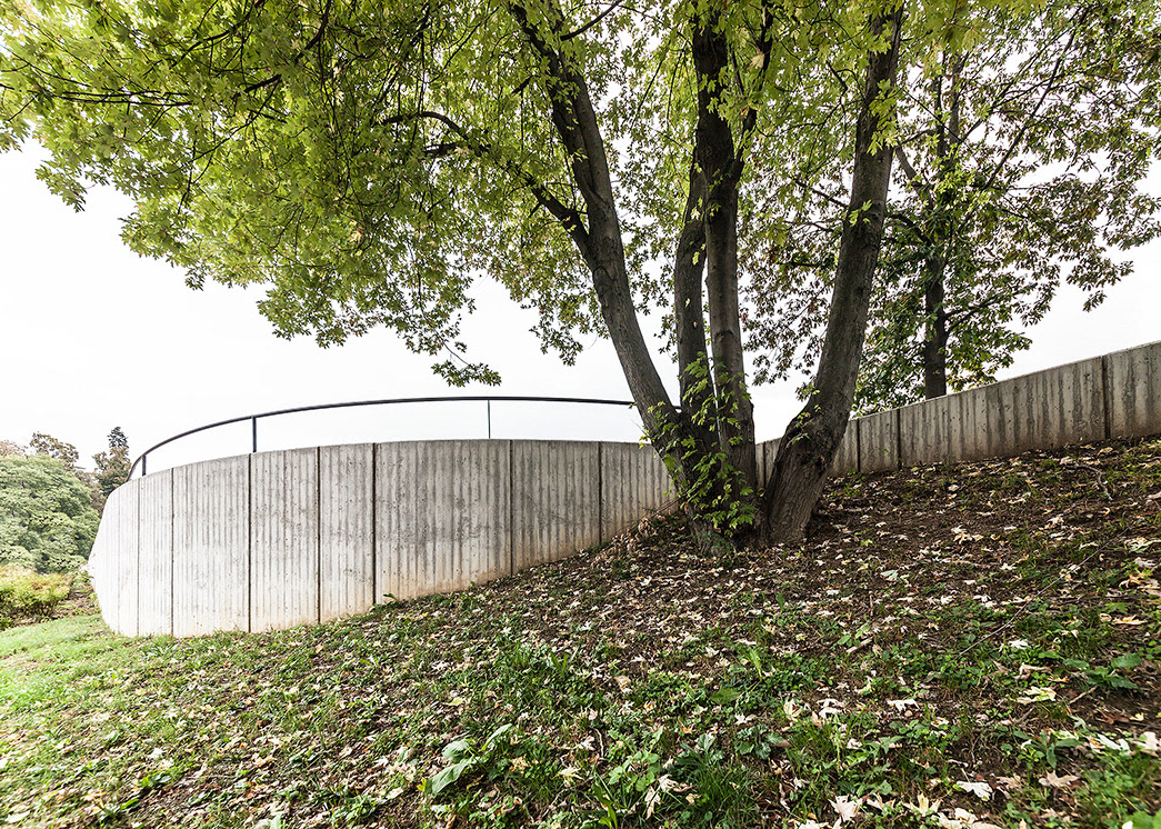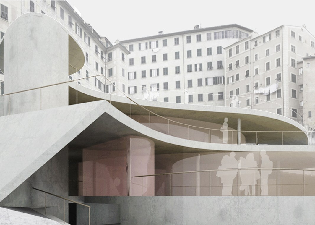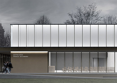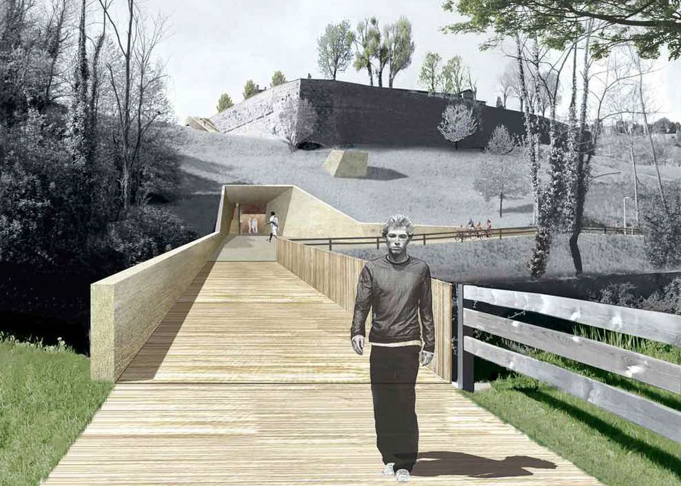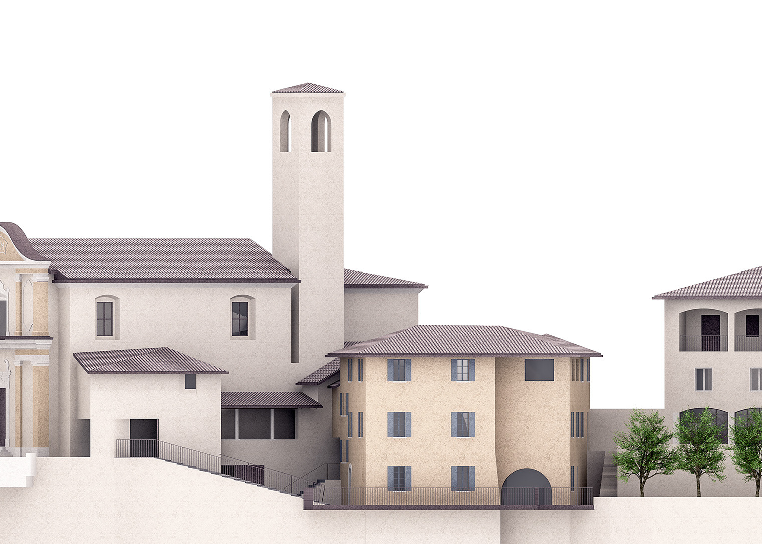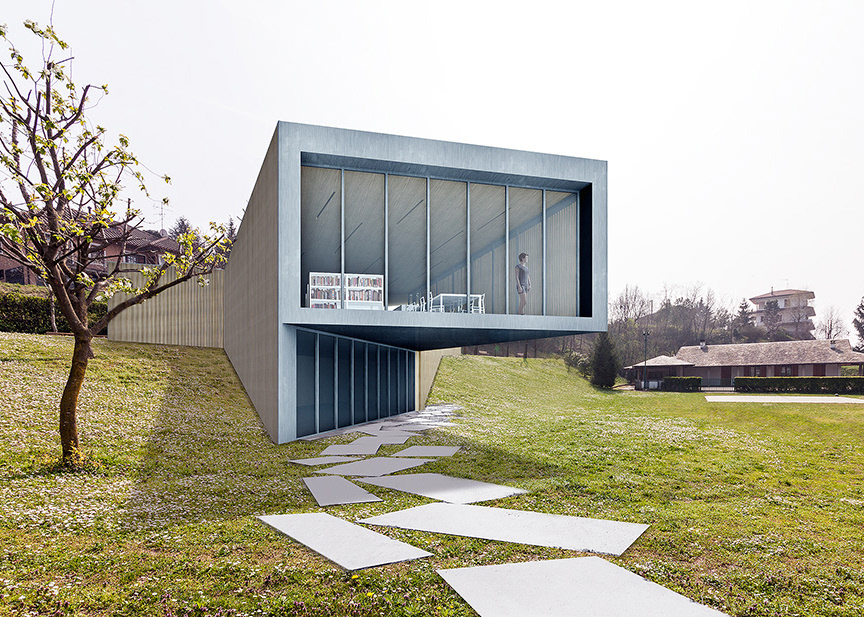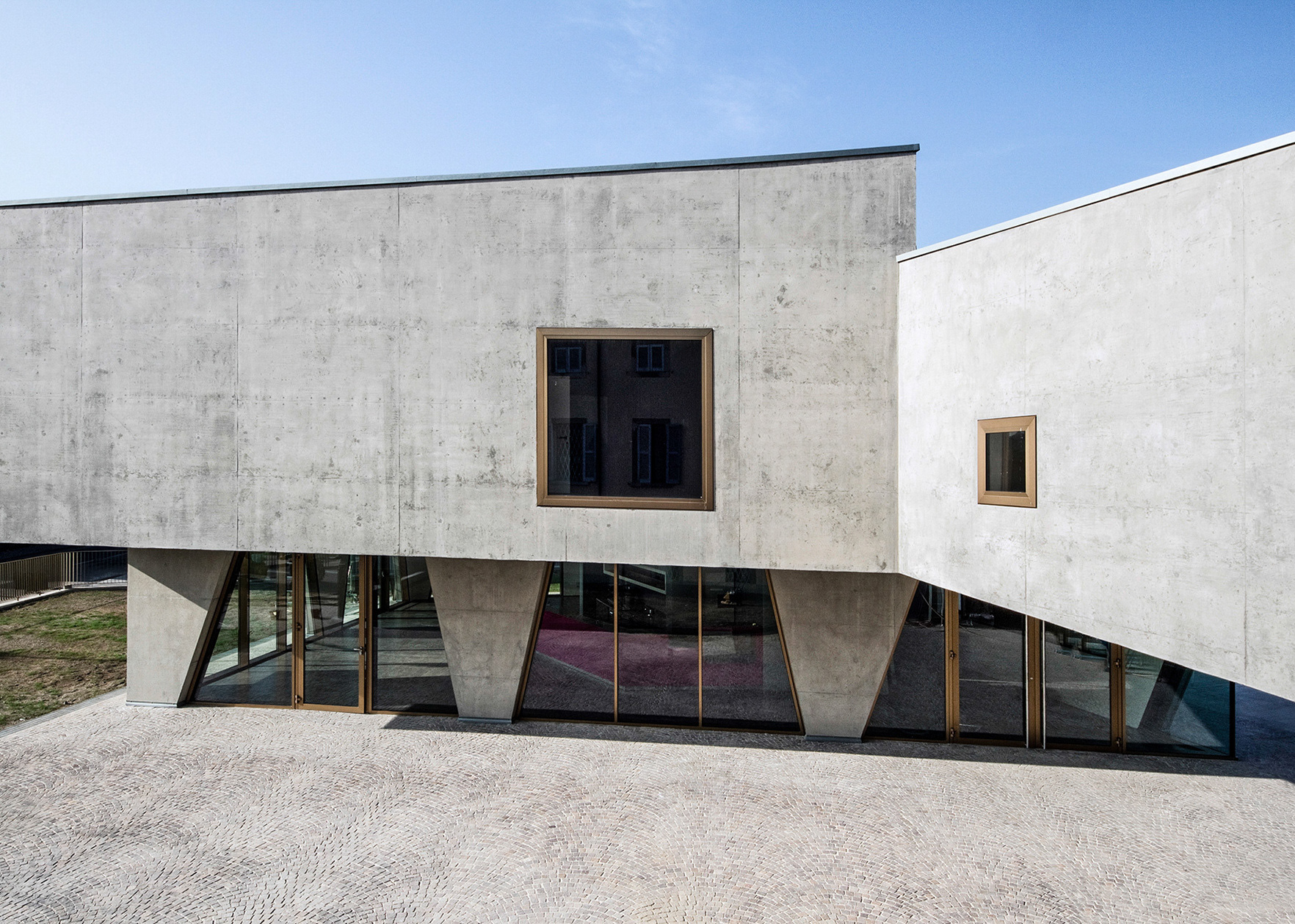Il nuovo edificio, si inserisce in modo coerente e misurato nel contesto. In forma di blocco compatto, esso si dispone al centro del lotto. Il volume si incastra nel terreno in pendenza senza alterarne l’andamento. L’insieme delle funzioni previste si dispongono su due soli livelli, creando relazioni di continuità tra interno ed esterno. Aggiungendo qualità allo spazio urbano essa diviene elemento rappresentativo e identitario per l’intera collettività, in grado di assolvere al ruolo di centro culturale e museale secondo un approccio semplice, flessibile e modulare. Verso gli edifici vicini il nuovo complesso assume il ruolo di “cerniera” tra pubblico e privato, mentre verso il fiume esso consolida più precisamente il ruolo urbano della riva sinistra in giustapposizione alla compattezza del centro storico che definisce la riva opposta.