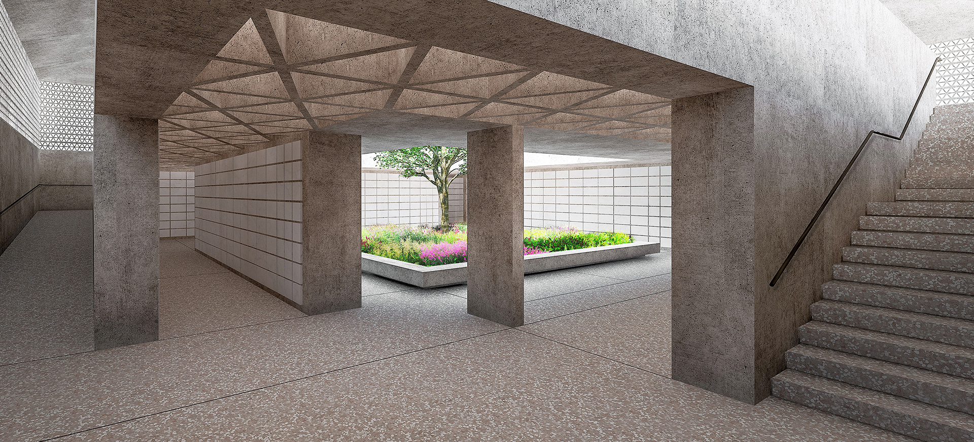 I quattro setti disposti attorno al giardino integrano, come nel Tempio già esistente, i pilastri strutturali e le urne. Inoltre si generano due percorsi distinti, uno interno alla corte che si affaccia sul giardino ed uno esterno verso il cimitero, collegati tramite quattro passaggi angolari tra i setti.