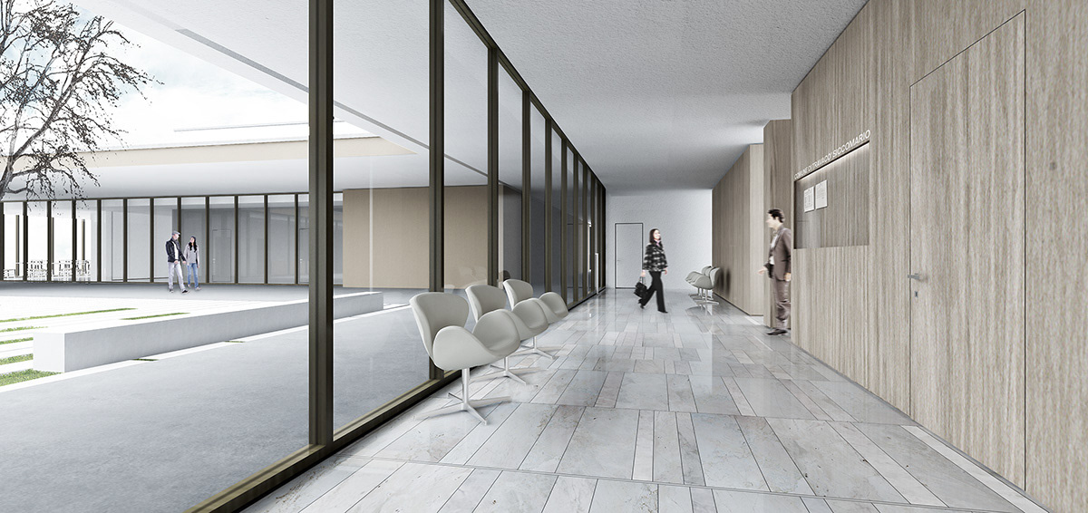 Un unico edificio in cui tutte le funzioni si dispongono su un piano leggermente rialzato rispetto al terreno. Verso l’esterno il nuovo edificio assume il ruolo di “cerniera” tra città e campagna, verso l’interno assume il compito di definire più precisamente i limiti del parco urbano esistente in giustapposizione al complesso monumentale della Chiesa.