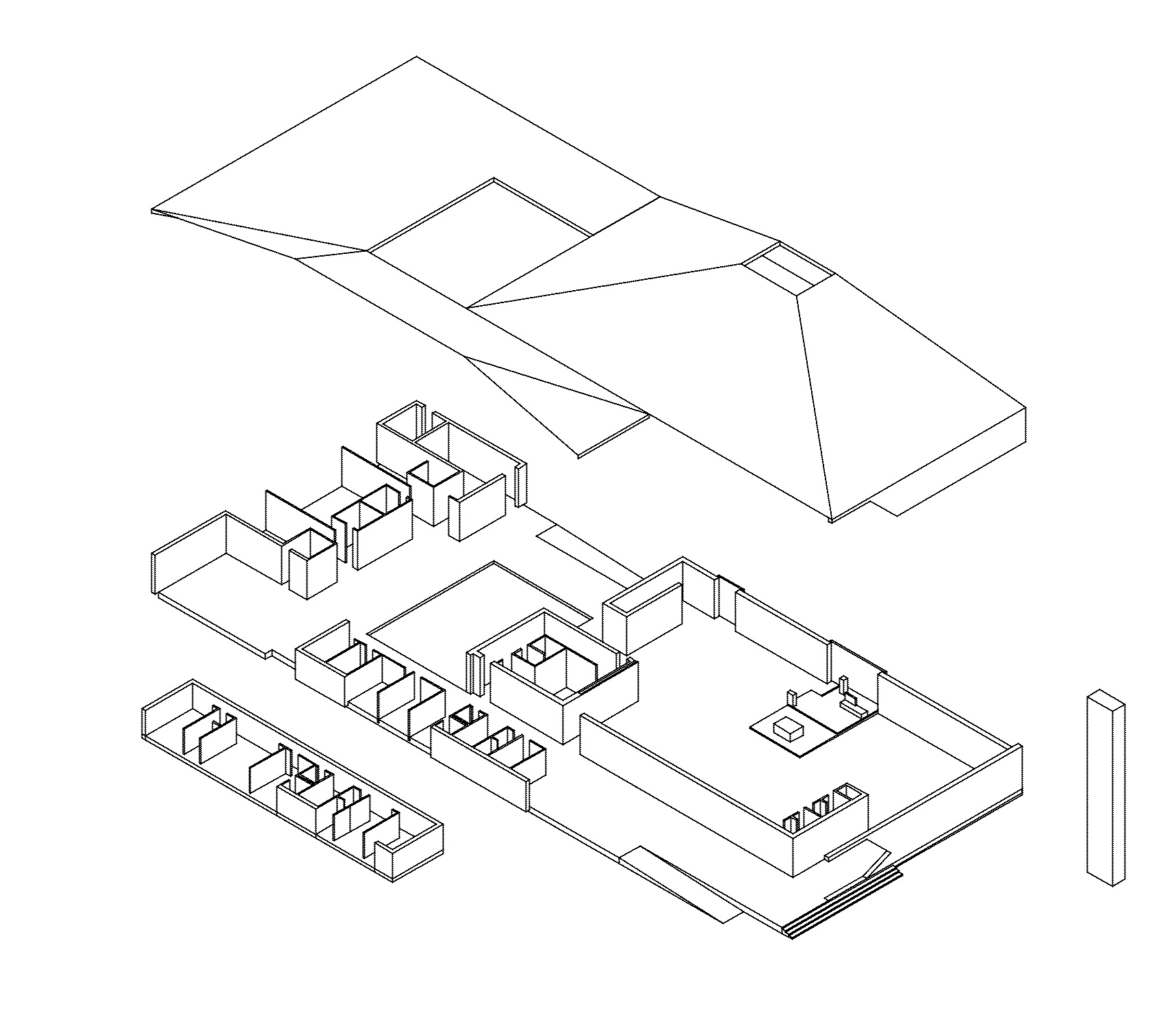 The proportion of the church, determined by the size of the portals, becomes the unit used to design and sizing of the new complex, alongside the issue of the rood rising from the horizontality of the earth, becomes angled line and then vertical, this the section of the project: the building is a large roof that receives and protects the community. The roof rises above the church becoming presence and urban reference.